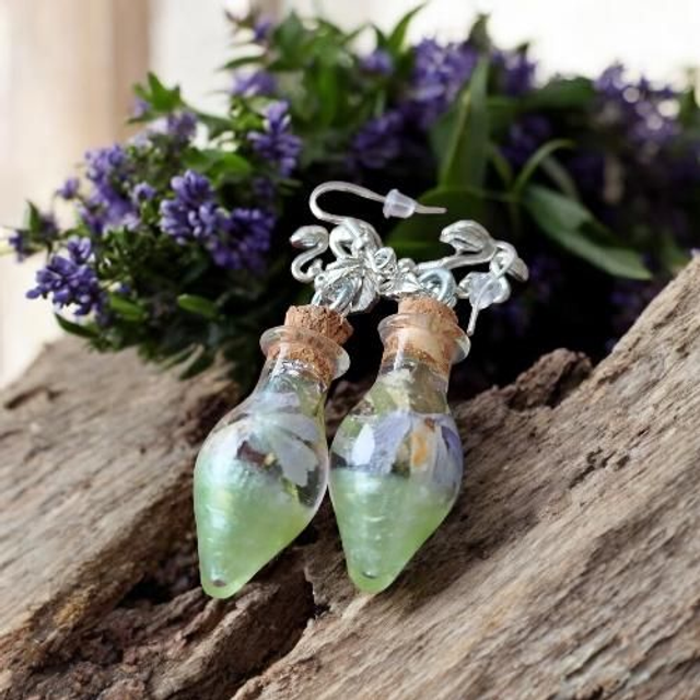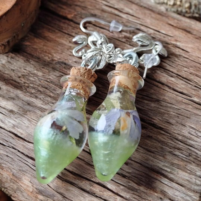 Magic bottle earrings with hypoallergenic hooks and silicone pins. Both colors come with dried flowers / plants that are available during the current season, I collect and dry almost everything myself. The material inside the bottle is resin. The bottle is glass. Please note that slight differences in tone are possible, because I make everything by hand from scratch. If there are no teardrop-shaped bottles available in bulk, I will put the earrings in a square-shaped magic bottle. I hope this is not a problem for you. ❤️