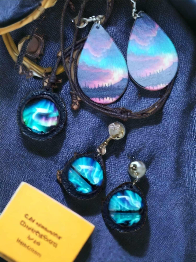Käsintehty lasi/vaneripuu revontulikapussi, tämä setti sisältää korvakorut hypoallergeenisilla koukuilla ja silikonistopperilla, sekä riipuksen nahkanauhalla/keinonahkanauhalla, sekä lahjarasian, läpinäkyvällä ikkunalla.