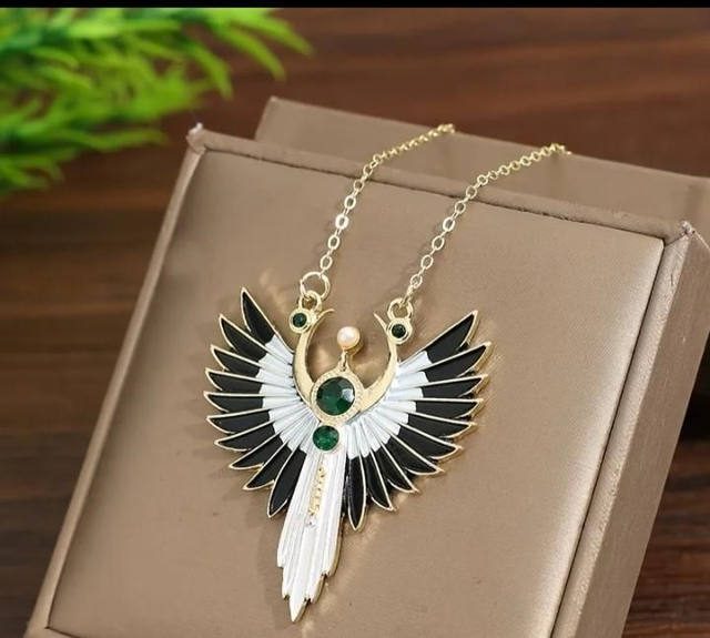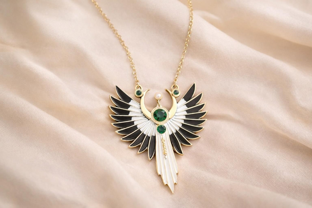 Emerald Sunwing Pendant symbolizes strength, protection and heart wisdom. The black and white wings represent balance between light and shadow, while the green gemstone radiates heart energy, growth and courage.
